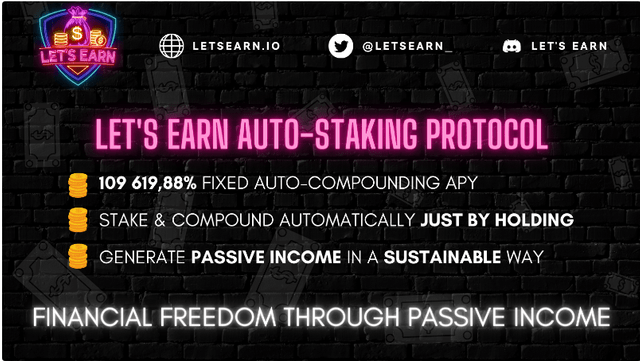 $LETSEARN will be the native token on the Binance Smart Chain (BEP20) with elastic strength. It rewards its holder with a positive rebase formula in a sustainable way. Where Auto-staking and Auto-compounding give the holder irresistible income which is stable and grows exponentially. Just hold the token as long as the portmanteau is decentralized (Trustwallet or Metamask recommended). The Let’s Earn ecosystem is backed by the $LETSEARN token, which has a very important part in the ecosystem. Without $LETSEARN, none of this would be possible.